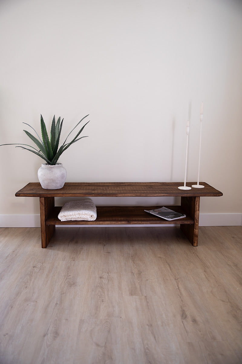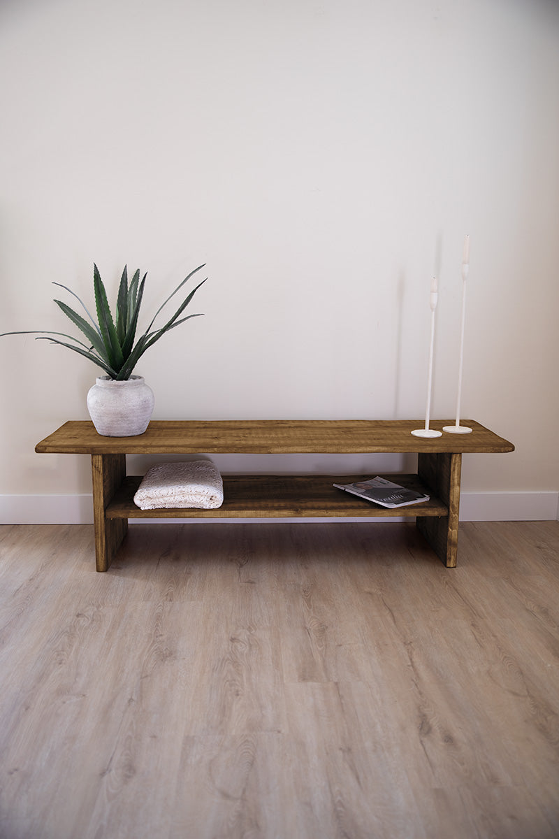 Lichte houten tv-meubel, ook handig als bankje of platform voor decoratie