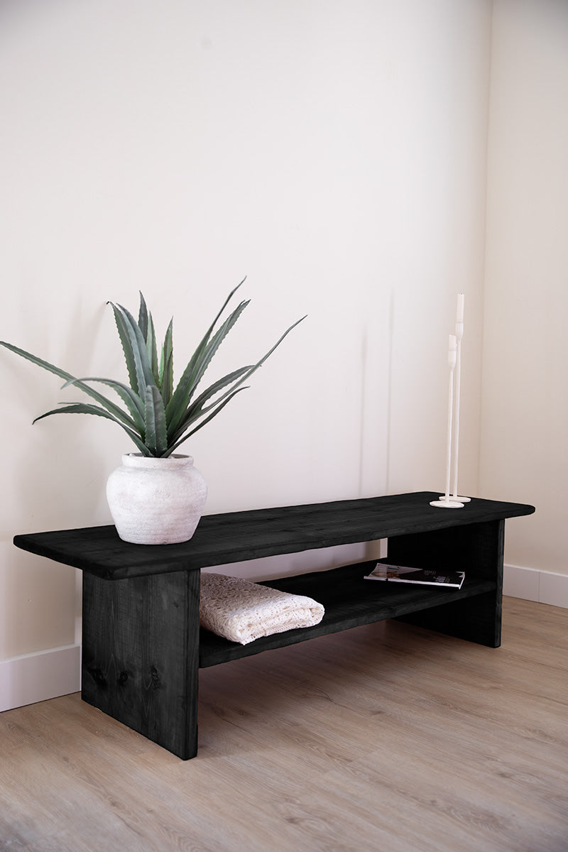 Houten zwarte tv-meubel dat ook gebruikt kan worden als lage sidetable